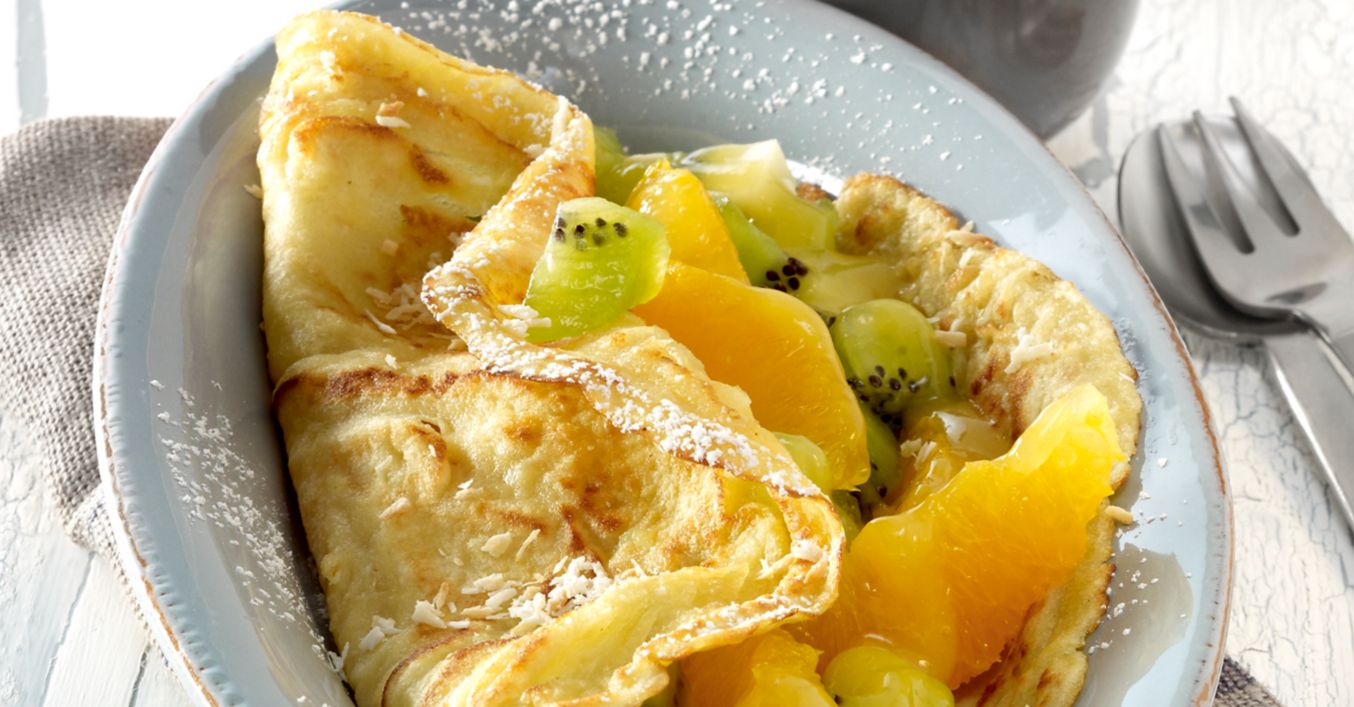 Kokos-Pfannkuchen mit Kiwi-Orangen-Füllung