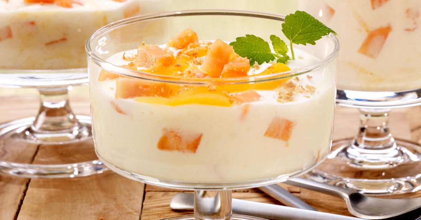 Sahne mit restlichem Zucker steif schlagen und sobald die Creme zu gelieren beginnt, Sahne und Papayawürfel unter die Creme heben. Creme in Dessertgläser oder -schalen füllen und circa 2 Stunden kalt stellen.