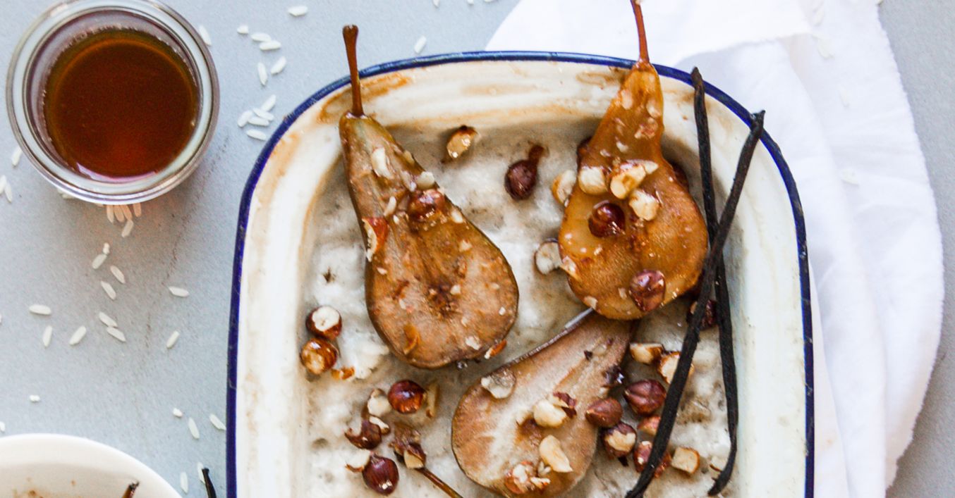 Kokosmilchreis mit gebackenen Birnen