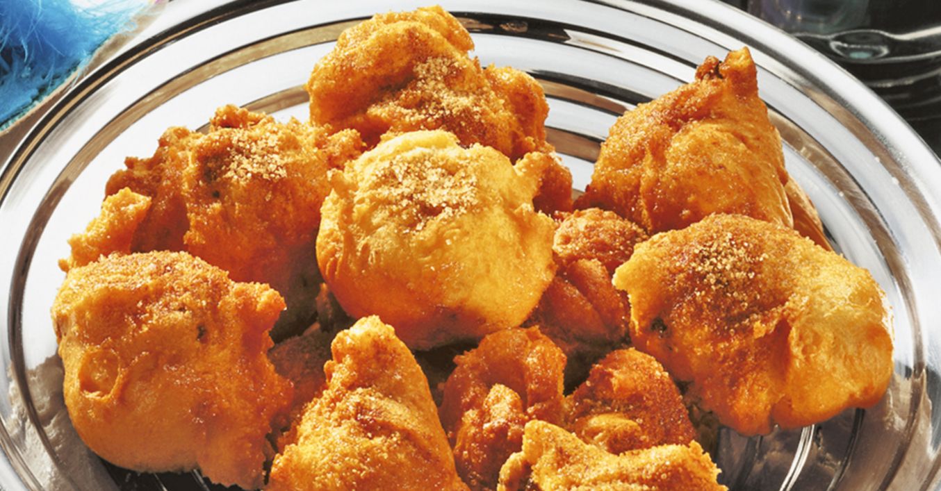 Eier nacheinander sorgfältig unterrühren. Rum, Mandeln und Rosinen zugeben. Fett auf 170 Grad erhitzen. Mit zwei Teelöffeln kleine Krapfen aus dem Teig abstechen und im Fett ca. drei Minuten goldbraun ausbacken.