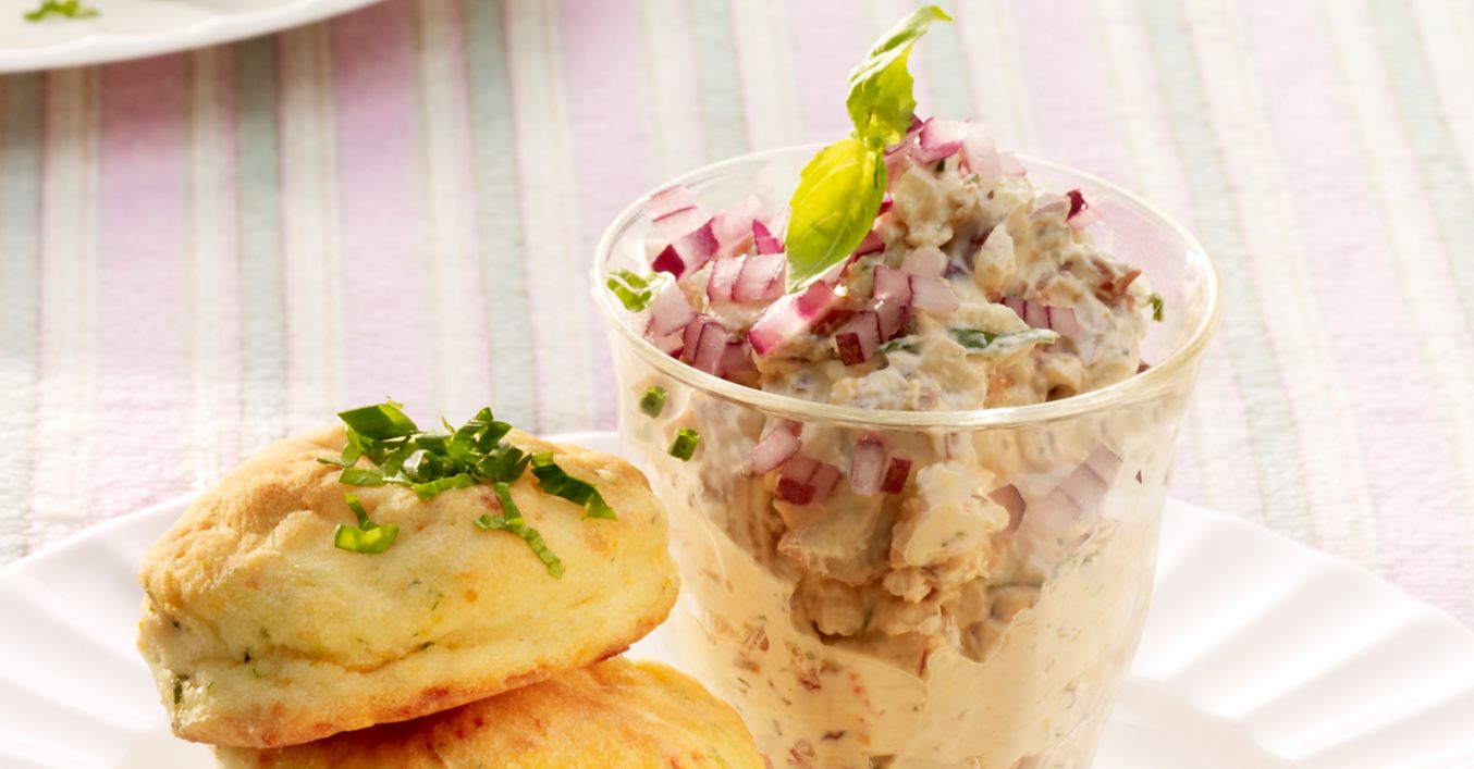 Mehl, Backpulver und Salz mischen. Schmand, Käse und Kräuter unterkneten. Den Teig auf einer bemehlten Arbeitsfläche circa 1,5 Zentimeter dick ausrollen und 8 Kreise von ca. 6 Zentimeter Durchmesser ausstechen. Eigelb und Milch verquirlen.