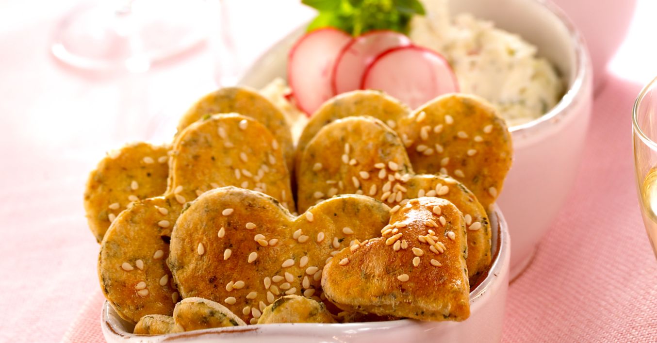 Den Teig zwischen Folie ca. 3 mm dick ausrollen, zu Herzen ausstechen, auf ein mit Backpapier ausgelegtes Backblech legen und mit verquirltem Eigelb bestreichen. Sesam überstreuen und im vorgeheizten Backofen bei 180 Grad Celsius (Gas: Stufe 3, Umluft 160 Grad Celsius) ca. 15 bis 20 Minuten goldbraun backen.