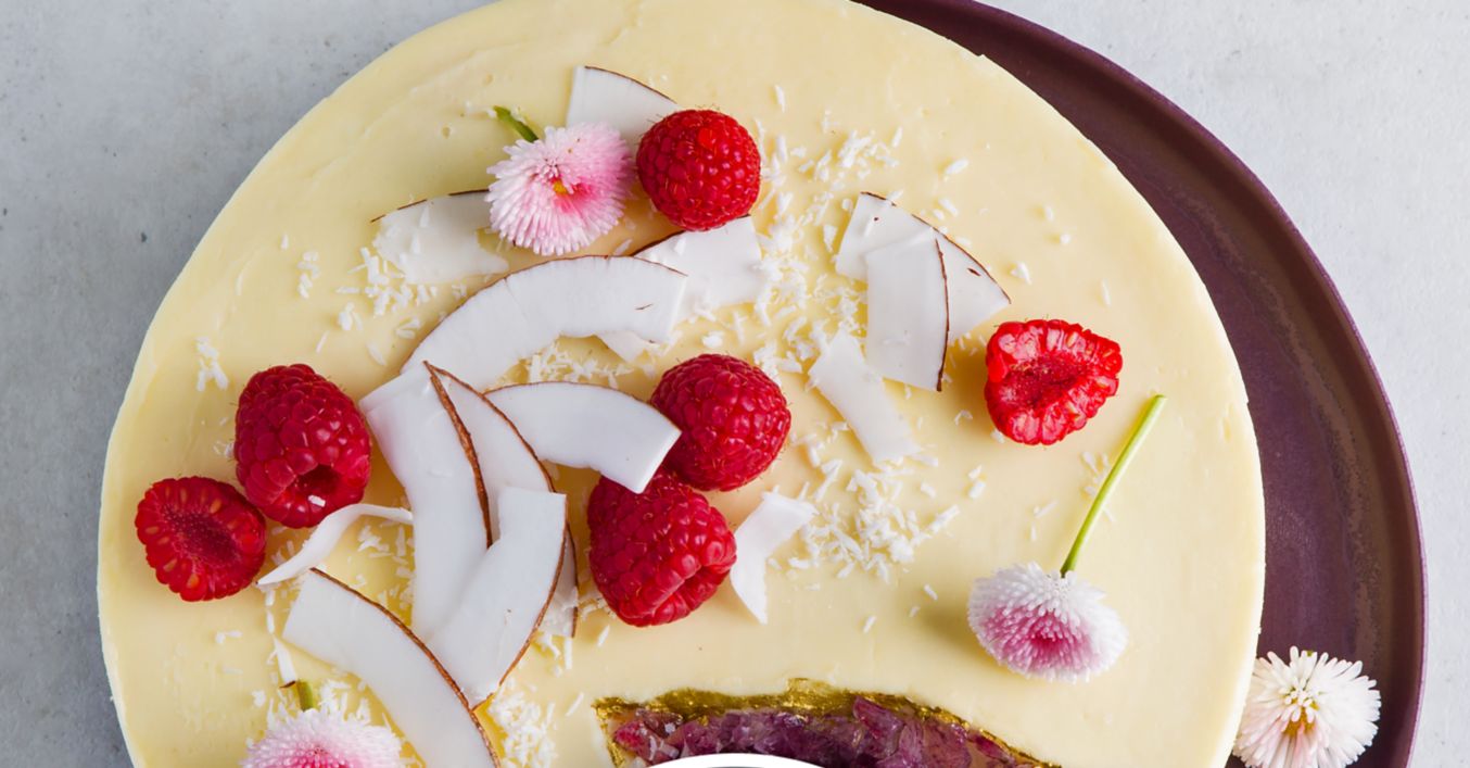 Oberfläche der Torte mit Kokosnussstücken, Himbeeren und Blumen dekorieren.