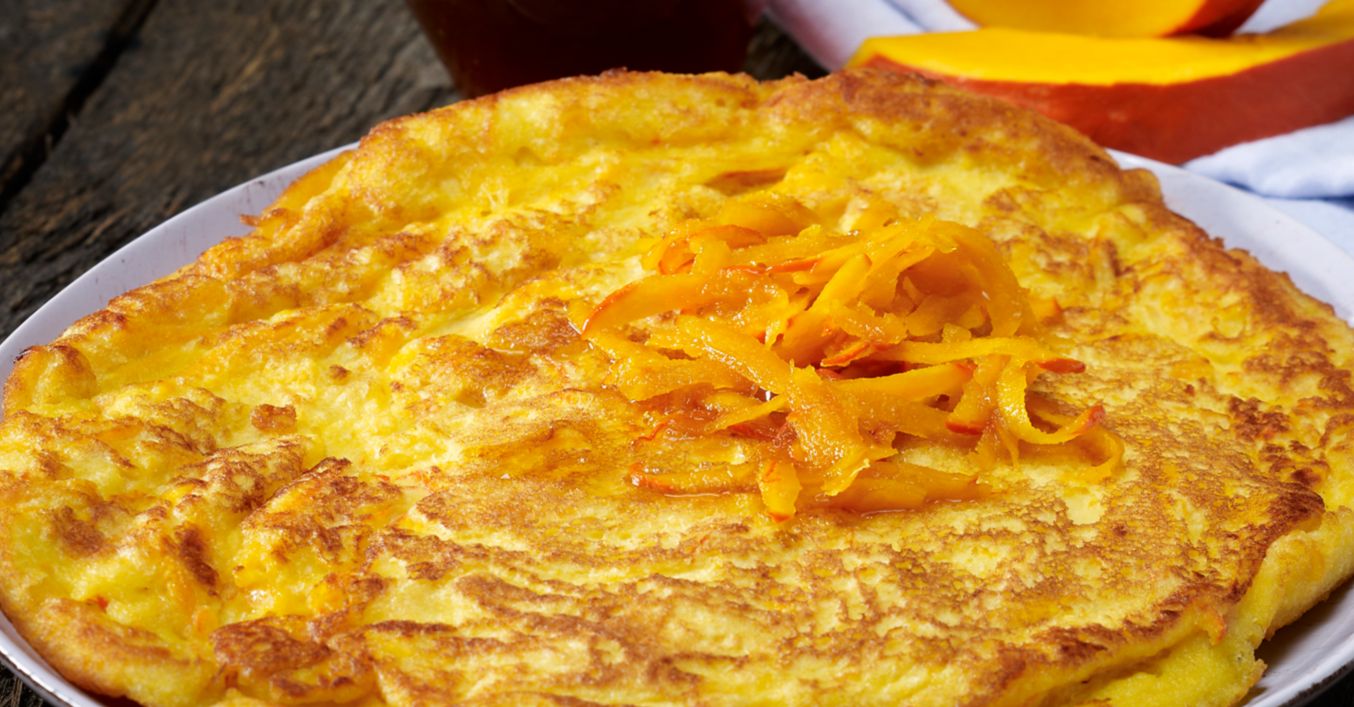 Etwas Butter in einer Pfanne zerlassen und nacheinander 4 Pfannkuchen goldbraun ausbacken. Pfannkuchen auf Teller anrichten, mit Sirup beträufeln und nach Wunsch mit karamellisierten Kürbisraspeln garniert servieren.