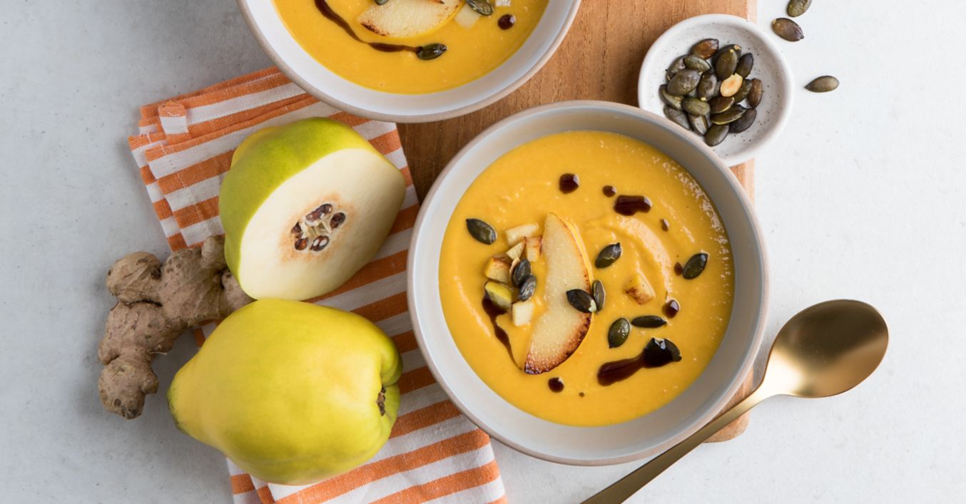 Kürbis-Quitten-Suppe auf 6 Schalen verteilen, mit Quittenwürfeln und Kürbiskernen bestreuen und mit Kürbiskernöl beträufelt servieren.
