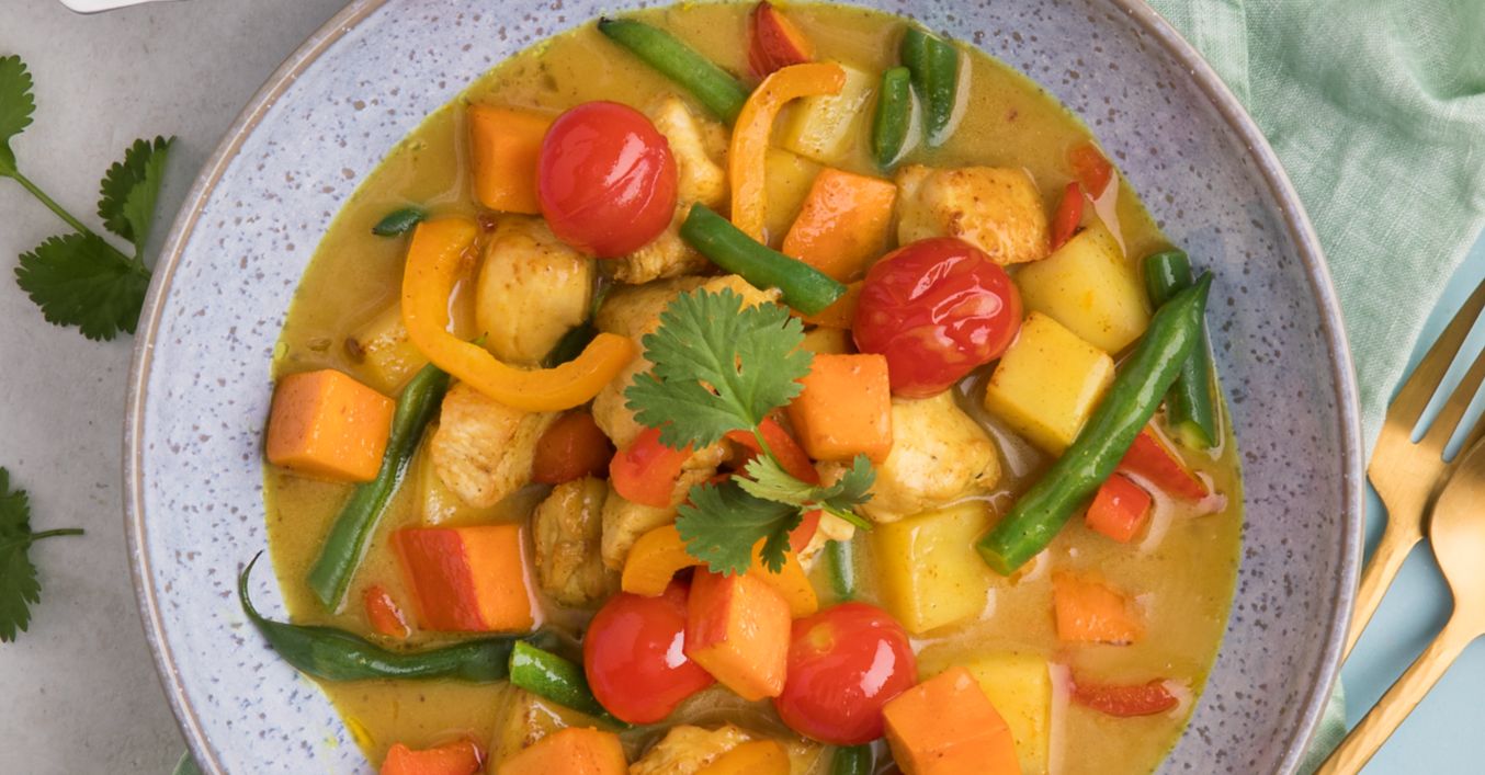 Öl erhitzen, Hähnchenbrustfilet hinzugeben und anbraten. Mit Currypulver bestäuben und anrösten. Tomaten, Kürbis, Kartoffeln, Paprikastreifen und Bohnen hinzufügen und andünsten. Kokosmilch und Brühe angießen, aufkochen und abgedeckt 15 bis 20 Minuten garen. Curry mit Salz, Pfeffer, Zucker und Curry abschmecken und nach Wunsch mit Fladenbrot servieren.
