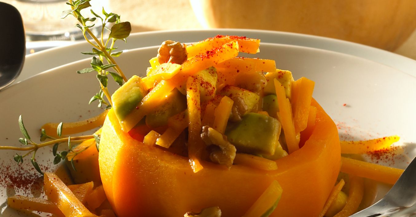 Avocado schälen, halbieren, den Kern herausnehmen und das Fruchtfleisch in kleine Würfel schneiden. Walnusskerne in grobe Stücke hacken und mit den übrigen Zutaten vorsichtig unter die Kürbisstreifen und Avocadowürfel heben. Pikant mit Salz, Pfeffer und Paprikapulver abschmecken und circa 30 Minuten marinieren lassen.