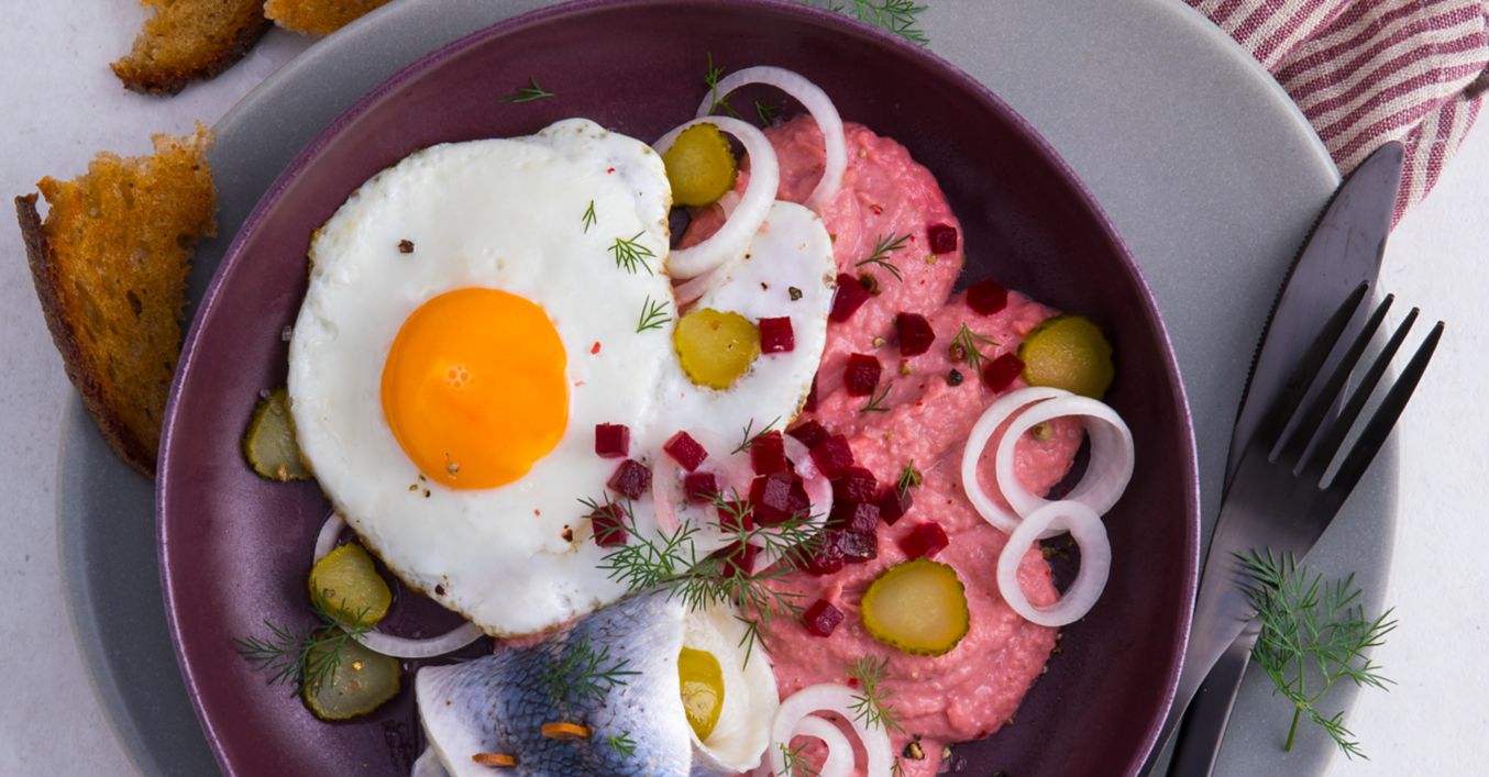 Öl in einer Pfanne erhitzen, Eier vorsichtig aufschlagen, in die Pfanne geben und bei mittlerer Hitze 3 bis 4 Minuten von einer Seite braten.Die Spiegeleier zusammen mit den Rollmöpsen, Rote-Bete-Würfeln, Gurkenscheiben sowie Zwiebelringen auf dem warmen Püree anrichten und mit Dillspitzen bestreut servieren.