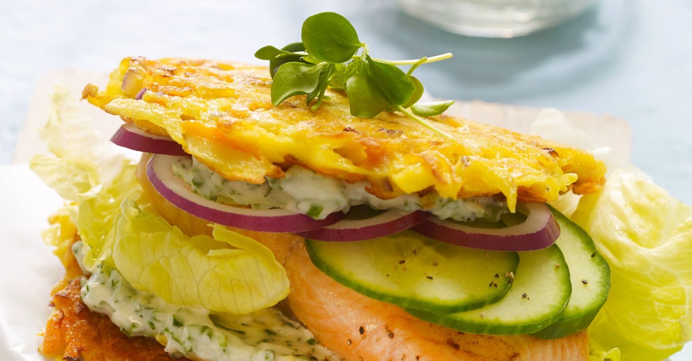 Mayonnaise mit Zitronenabrieb und Kräutern vermischen und Rösti damit bestreichen. Salat waschen und trockentupfen. 4 Rösti mit Salat, Lachs, Gurke und Zwiebelringen belegen.