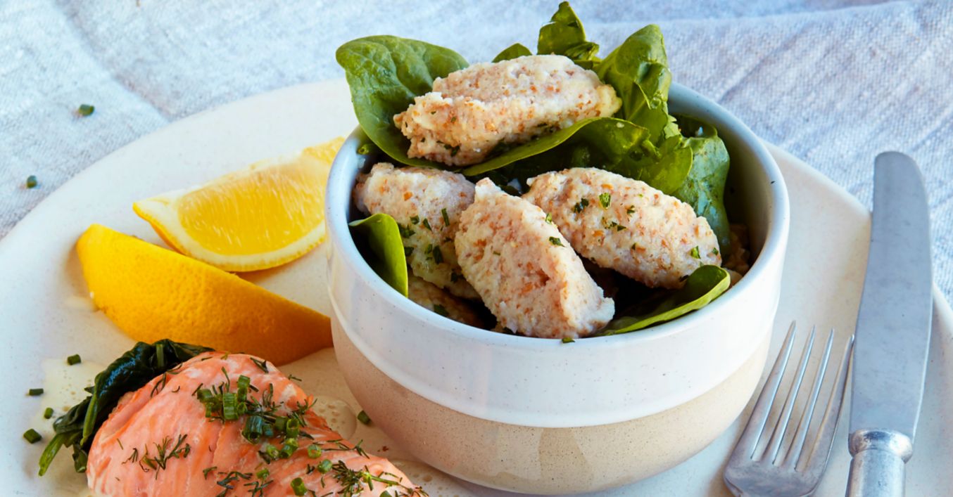 Lachs-Spinat-Roulade mit Honig-Senf-Lias und Dinkel-Gnocchi