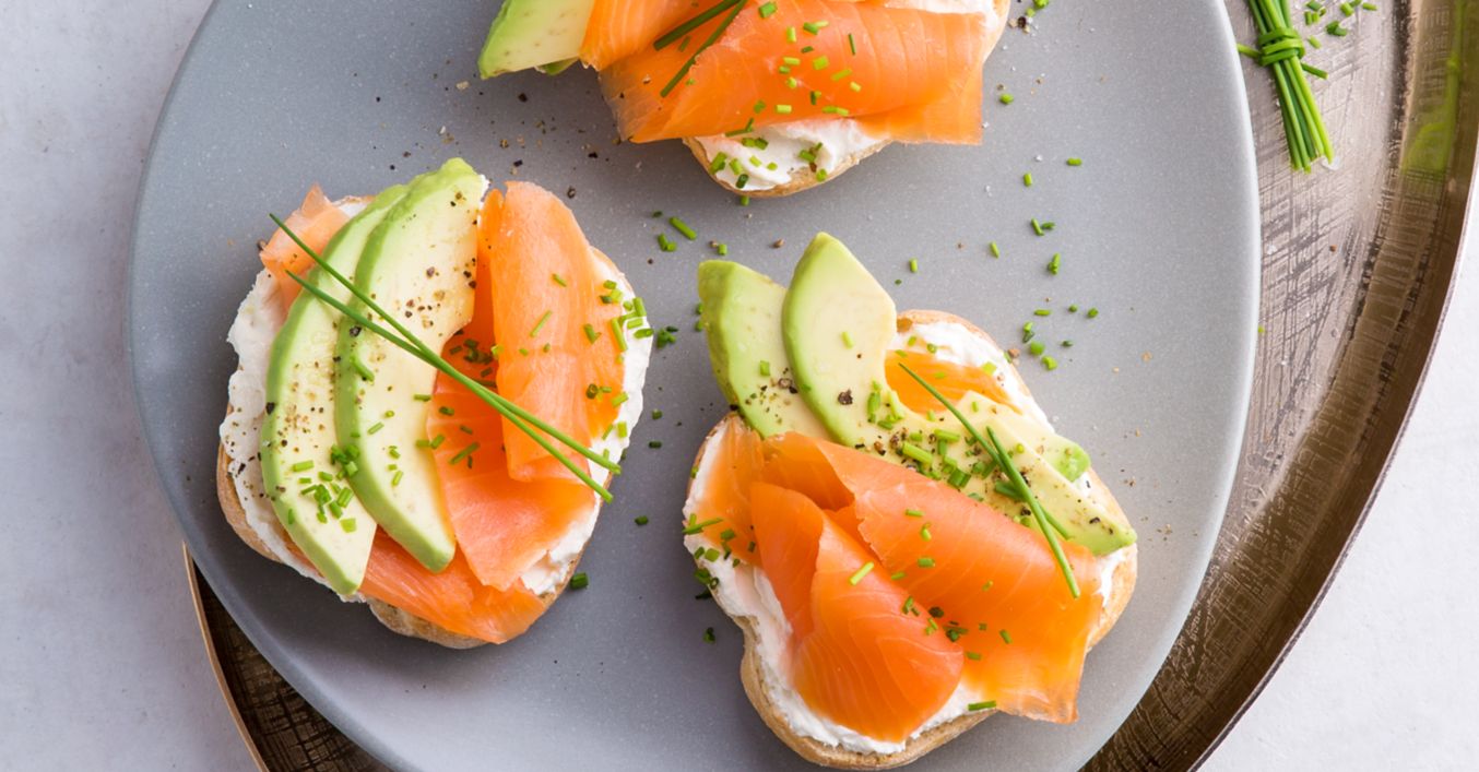 Avocado halbieren, entsteinen, Fruchtfleisch mit einem Löffel aus der Schale lösen, in Spalten schneiden und leicht salzen und pfeffern. Avocadospalten ebenfalls auf die Bagelhälfte geben und mit Schnittlauchröllchen garniert servieren.