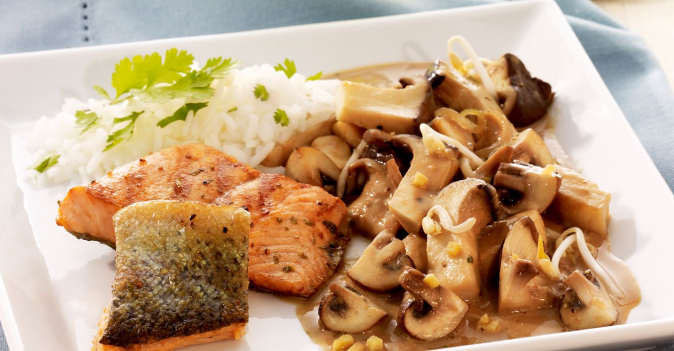 Sprossen verlesen, evtl. waschen, zu der Pilzmischung geben, kurz mit erhitzen und mit Koriander, Kumin, Salz und Pfeffer abschmecken. Fischfilet in restlichem heißem Öl von jeder Seite 3 bis 4 Minuten braten. Asia-Pilze mit Lachsforellenfilet und Reis auf Teller anrichten und servieren.