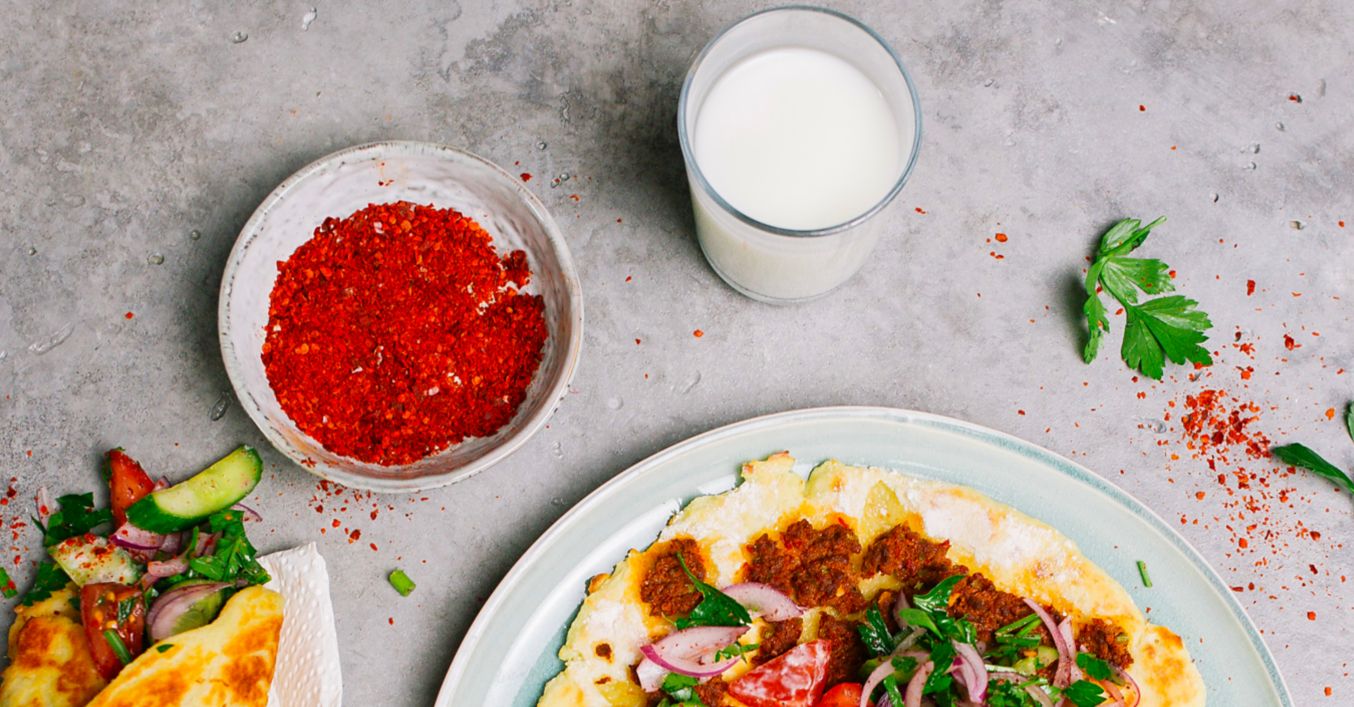 Für das Ayran 300 Milliliter kaltes Wasser, Joghurt und Salz in ein verschließbares Gefäß geben und kräftig schütteln. Salat auf den Teigfladen verteilen und Lahmacun mit Ayran servieren.
