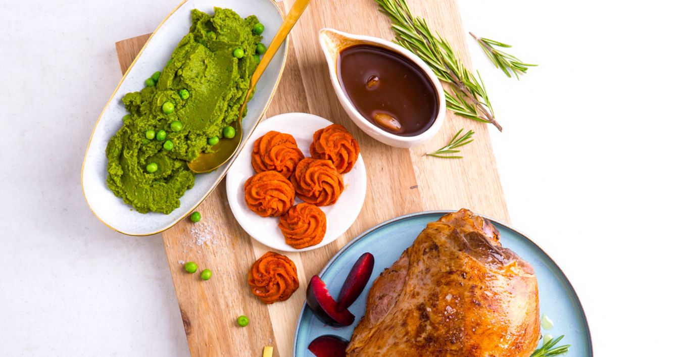 Lammkeule mit Kartoffel-Tomatenrosetten und Erbsenpüree