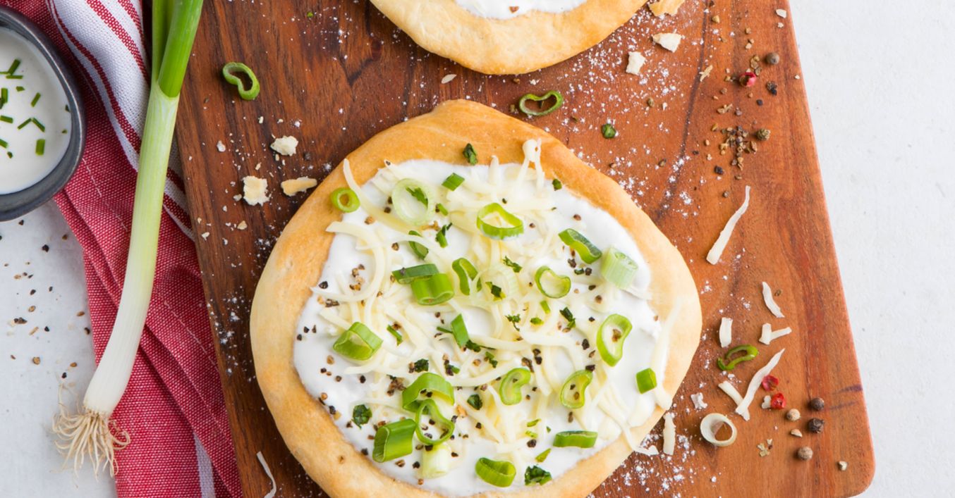 Lauchwiebel waschen, Enden entfernen und in feine Ringe schneiden. Crème fraîche auf die Lángos verteilen und mit Käse und Lauchwiebeln bestreuen. Nach Wunsch mit gehackten Kräutern garniert servieren.