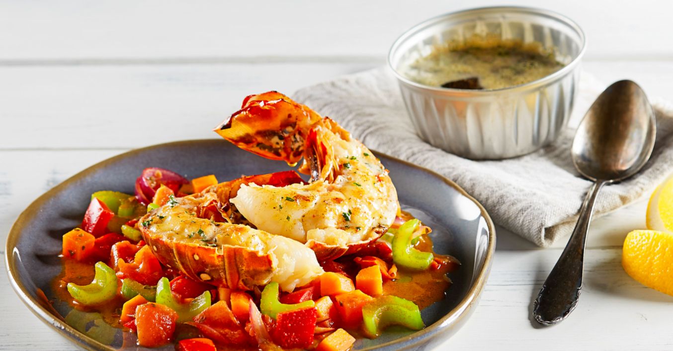 Das kreolische Gemüse auf Tellern anrichten, die Langustenhälften darauf setzen und mit den Zitronenecken garnieren. Mit der gebräunten Butter servieren.