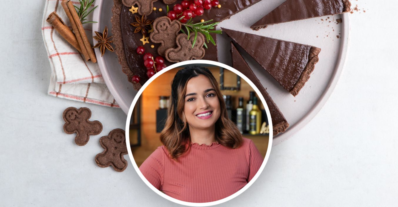 Dreiviertel des Teigs in eine Tarteform (26 Zentimeter Durchmesser) legen und einen circa 2 Zentimeter hohen Rand formen. Den restlichen Teig ausrollen und Lebkuchen- und Sternmotive ausstechen. Beides 30 Minuten kühl stellen. In der Zwischenzeit den Backofen auf 190 °C Ober- und Unterhitze vorheizen. Anschließend Teigboden und Lebkuchenmännchen 12 Minuten backen.