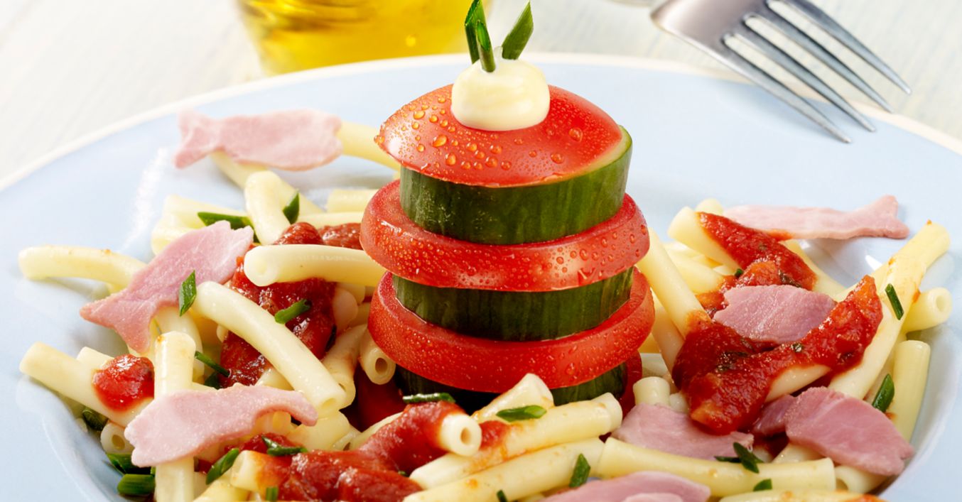 Nudeln in Salzwasser circa 8 bis 10 Minuten garen. Aus dem Kochschinken mit einem kleinen Ausstecher „Fische“ ausstechen. Tomaten und Gurke waschen, bei den Tomaten den Stielansatz entfernen. Tomaten und Gurke in dicke Scheiben schneiden und als „Leuchtturm“ aufeinandersetzen.