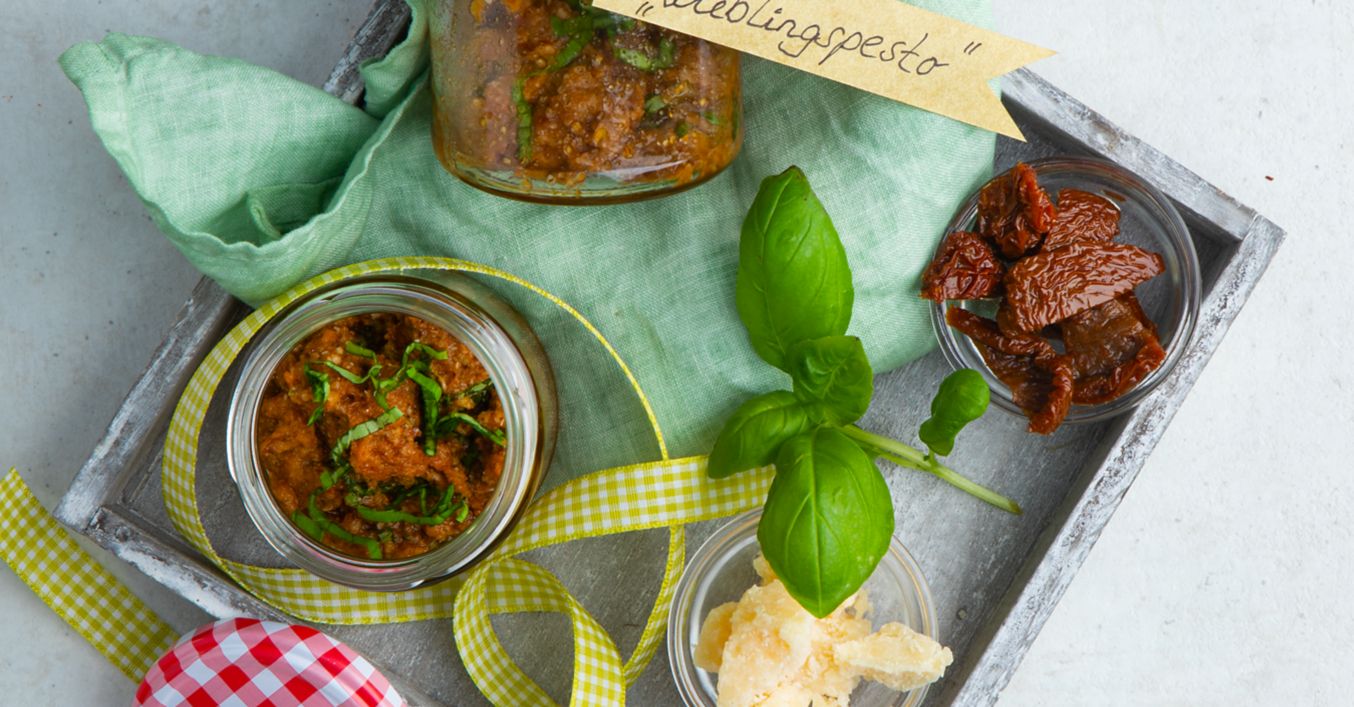 Pesto mit Salz und Pfeffer würzen, in Gläser füllen, verschließen und verschenken.