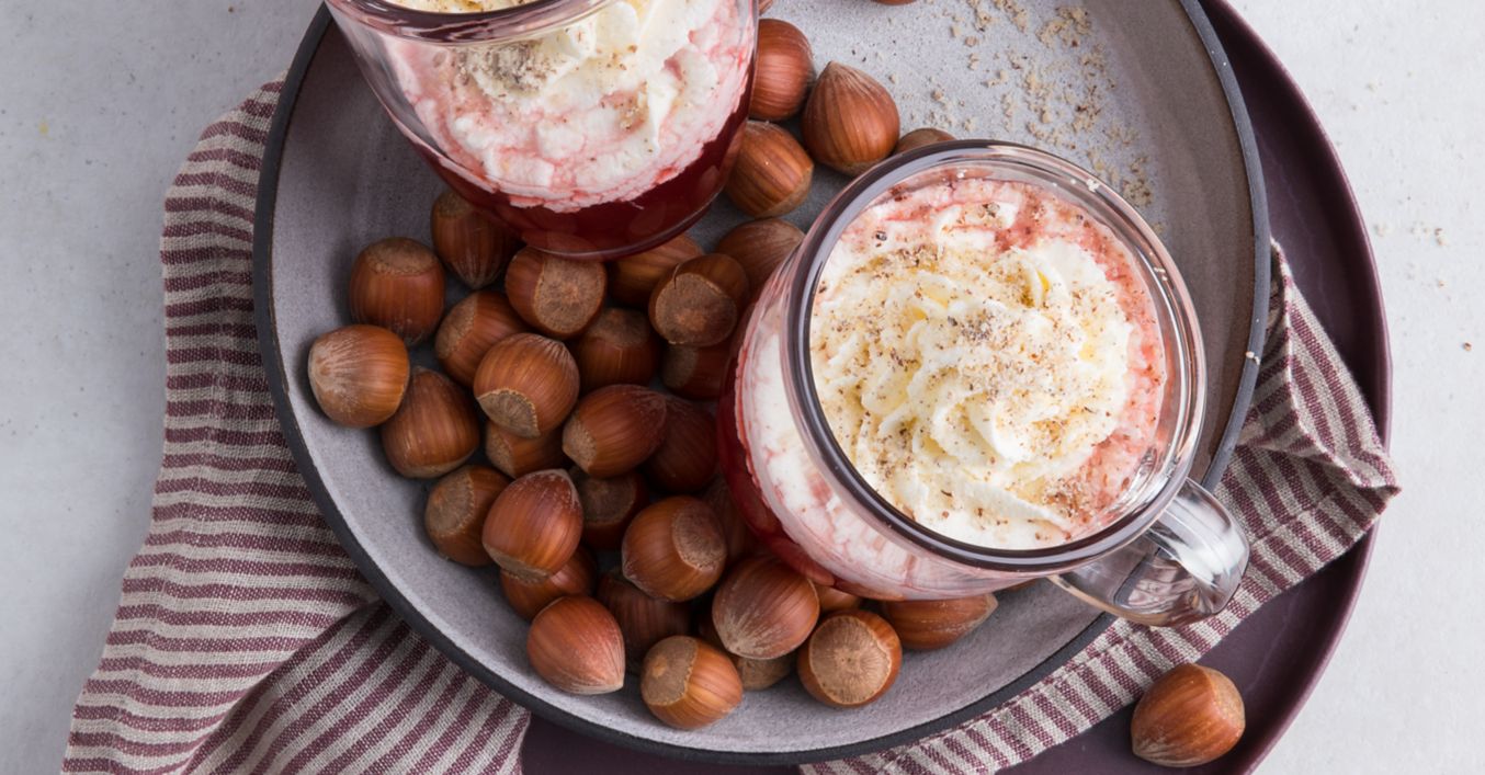 In ein Glas geben und mit einer Sahnehaube und mit Haselnüssen betreut servieren.
