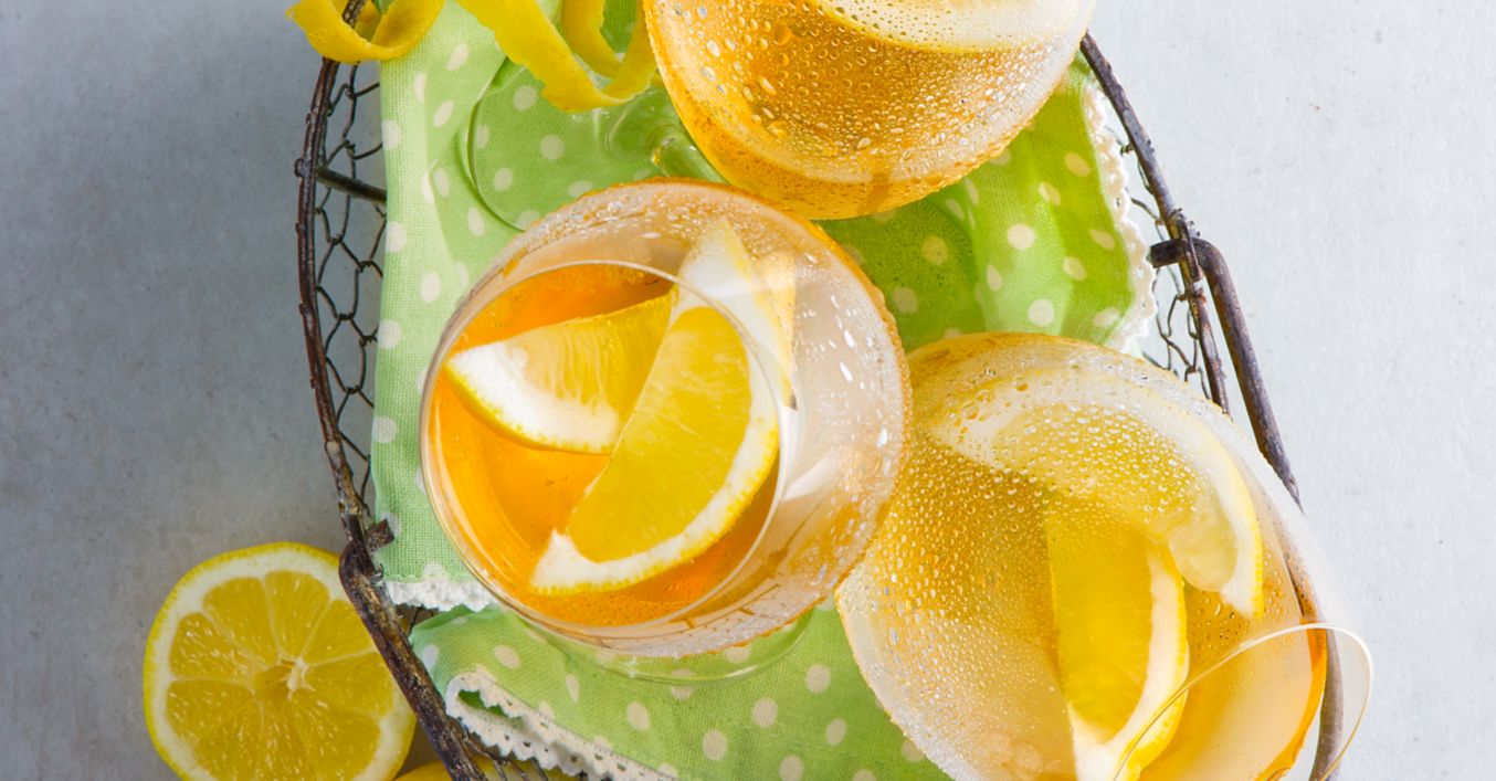Zitrone waschen und in Spalten schneiden. Zitronenspalten in den Cocktail geben und servieren.