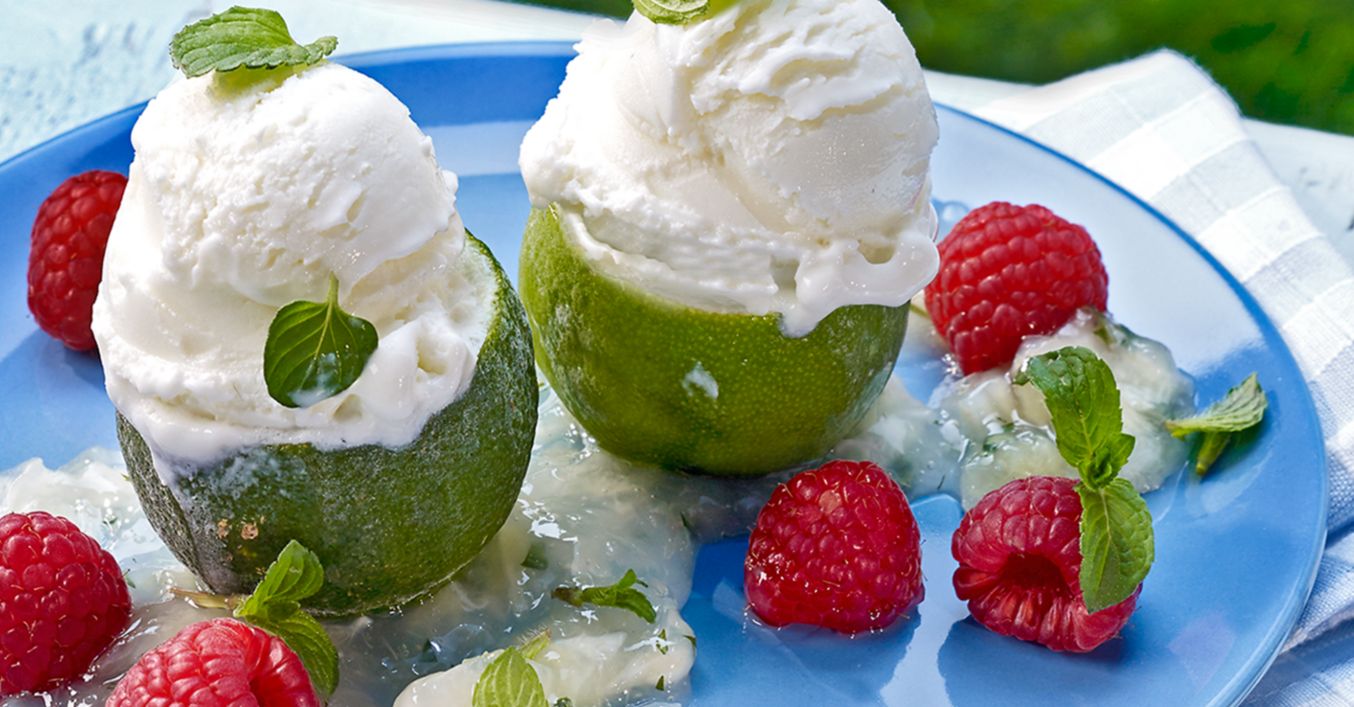 Eiscreme Joghurt mit einem Eisportionierer in die Limetten füllen, auf Tellern anrichten, mit Limettensoße und nach Wunsch mit frischen Himbeeren und Minze servieren.