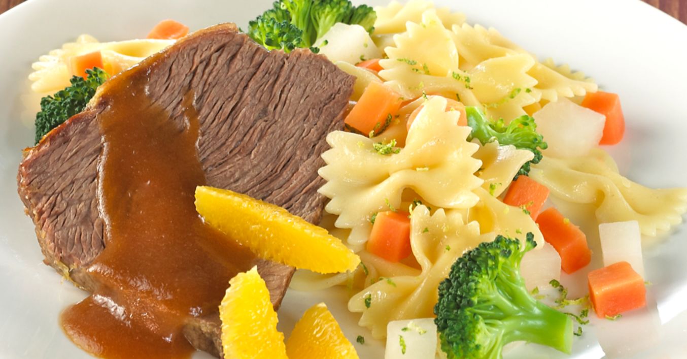 Gemüsenudeln, Braten und Soße auf Tellern anrichten.