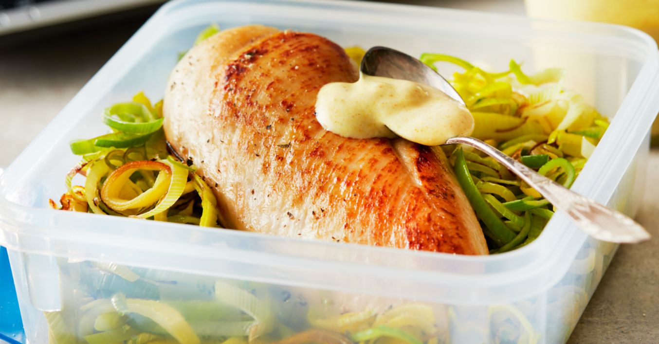 Restlichen Limettensaft über die Hähnchenbrustfilets und den Porree gießen. Mit Salz und Pfeffer abschmecken. Zum Mitnehmen abkühlen lassen, kühl stellen und am Arbeitsplatz in der Mikrowelle erwärmen. Den Curry-Dip dazu essen.