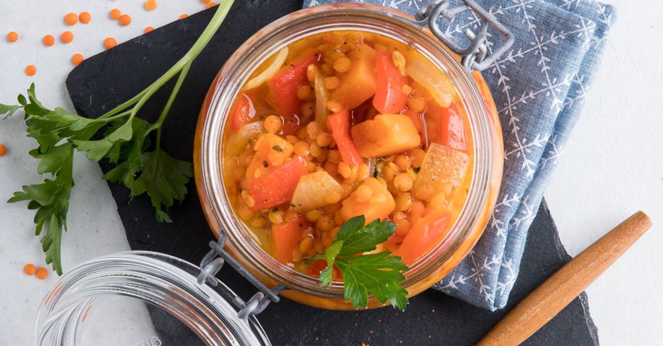 Brühe angießen, Linsen zufügen, aufkochen und abgedeckt circa 15 bis 20 Minuten garen. Chili mit Salz, Pfeffer, Kreuzkümmel und Chilipulver abschmecken und zum Mitnehmen verpacken.