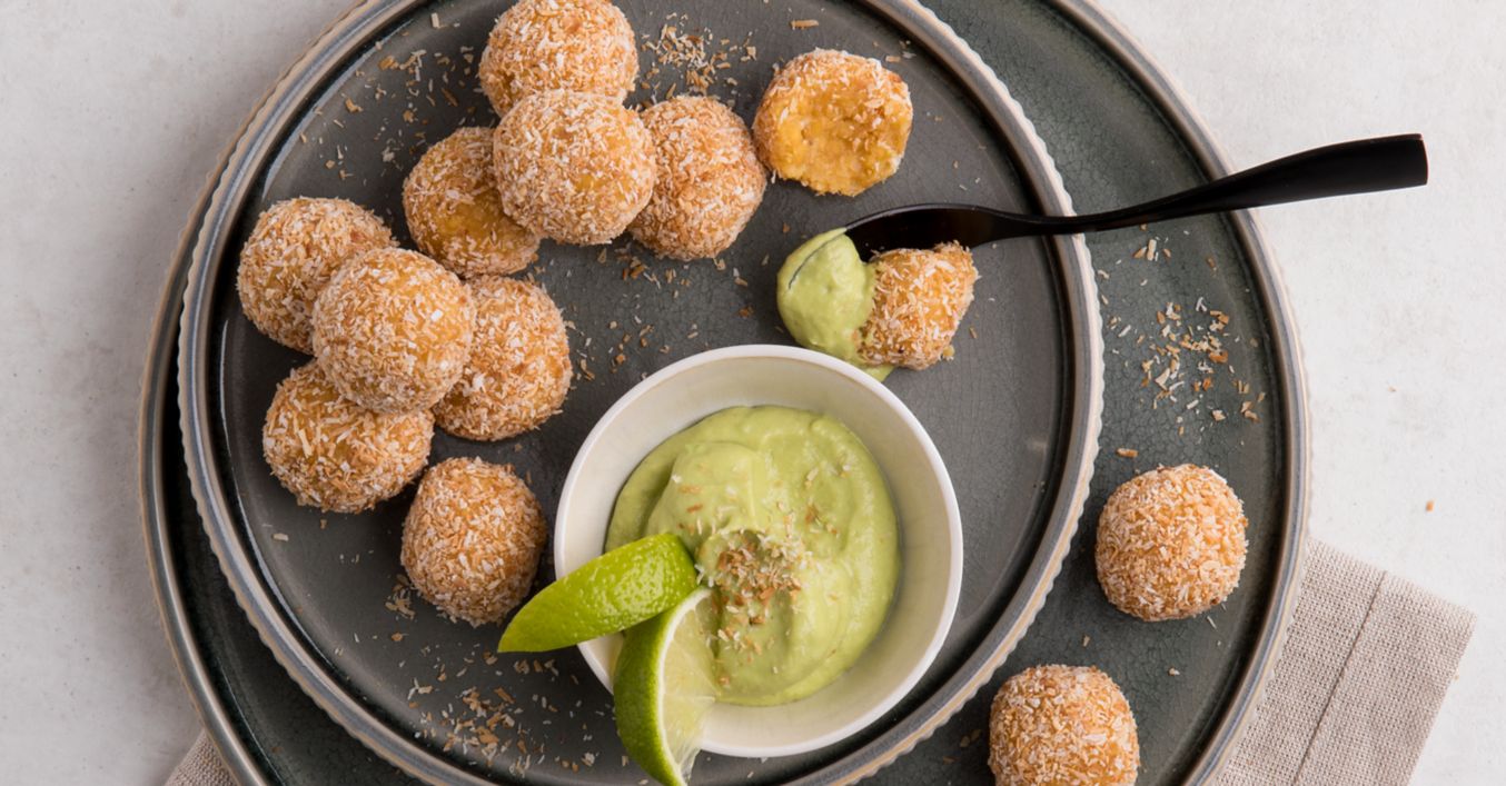 Für die Avocadocreme Saft und Abrieb der Bio-Limette mit der Avocado, dem Ahornsirup und dem Frischkäse pürieren. Die Pralinen mit der Avocadocreme servieren.