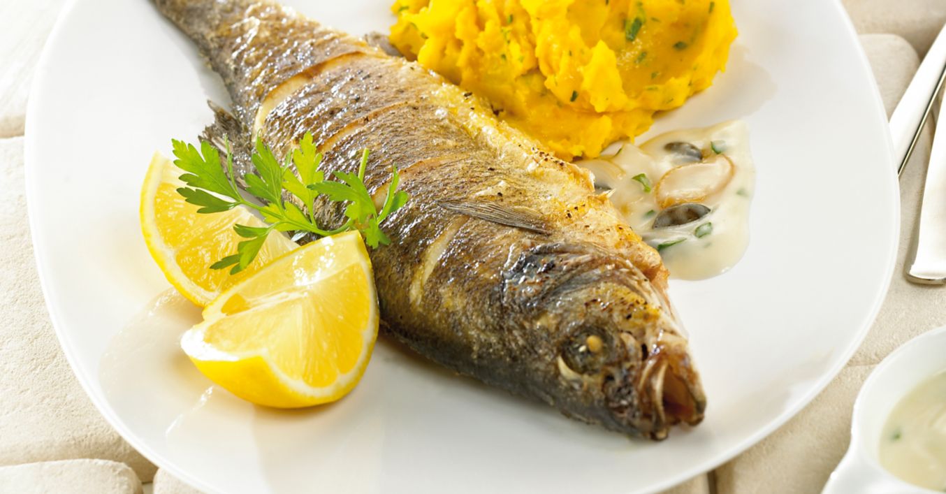 Loup de mer mit Kürbis-Kartoffelpüree, Soße und nach Wunsch mit Zitronenspalten servieren.