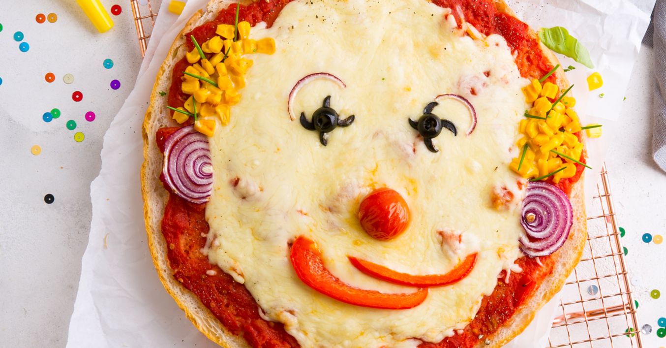 Paprika waschen, entkernen und in Streifen schneiden. Kirschtomate halbieren. Zwiebel abziehen und in Scheiben schneiden. Paprikastreifen als Mund und Augenbrauen, Tomatenhälften als Nase, Zwiebelscheiben und Oliven als Augen verwenden sowie den Mais als Haare auf den Pizzas verteilen. Im vorgeheizten Backofen bei 180 Grad (Umluft: 160 Grad) ca. 15 Minuten backen. Schnittlauch in große Ringe schneiden, auf dem Mais verteilen und servieren.