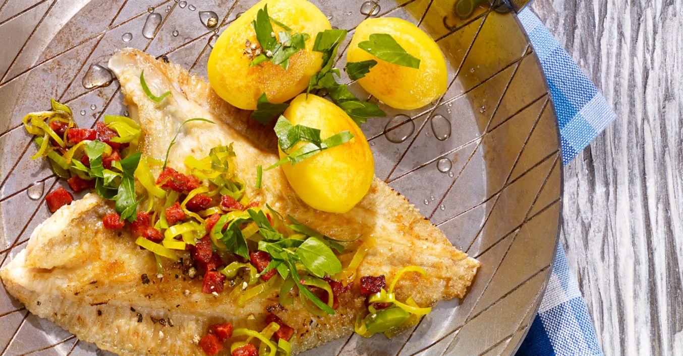 Restliches Öl erhitzen, Chorizo darin 1 Minute anbraten, Lauch zufügen und circa 6 Minuten dünsten. Kartoffeln in erhitzter Butter circa 1 bis 2 Minuten schwenken. Salat mit Dressing vermischen. Scholle anrichten, mit Topping und Petersilie bestreuen und mit Salat und Butterkartoffeln servieren.