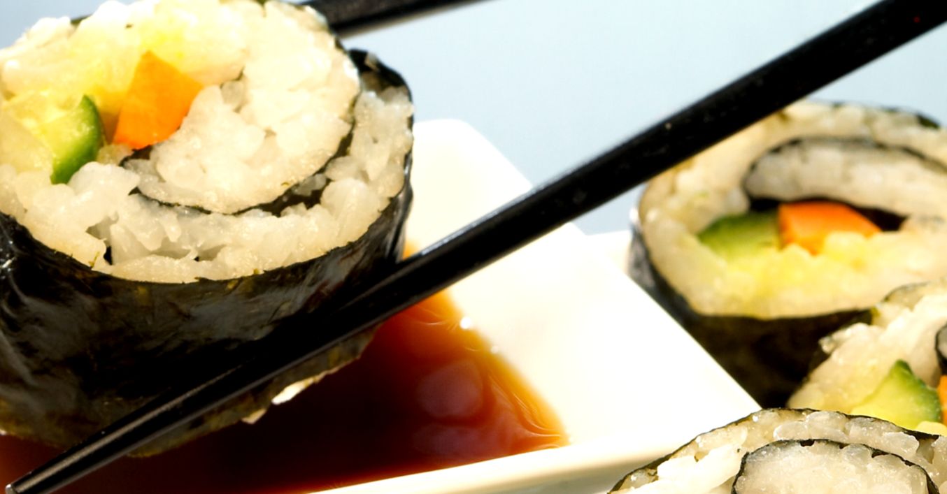 Nach diesem Verfahren weitere 3 Rollen herstellen, aus jeder Rolle 6 bis 8 Stücke schneiden und auf einer Platte anrichten. Maki-Sushi nach Wunsch mit Sojasauce servieren.