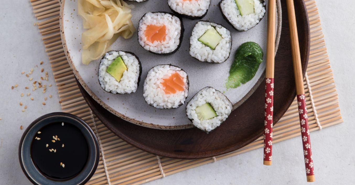 1 Gurkenstift im unteren Drittel längs auf den Reis legen. Freigelassene obere Seite leicht anfeuchten. Bambusmatte vorsichtig und mit festem Druck von unten nach oben einrollen. Anschließend nochmals öffnen und Vorgang mit leichten Druck wiederholen. Bei der Avocado das gleiche Prinzip anwenden. Lachs auf den Reis legen, bei Bedarf den Lachs zuschneiden, sodass er durchgängig von vorne bis hinten verläuft. Vorgang wiederholen bis alle Zutaten aufgebraucht sind.