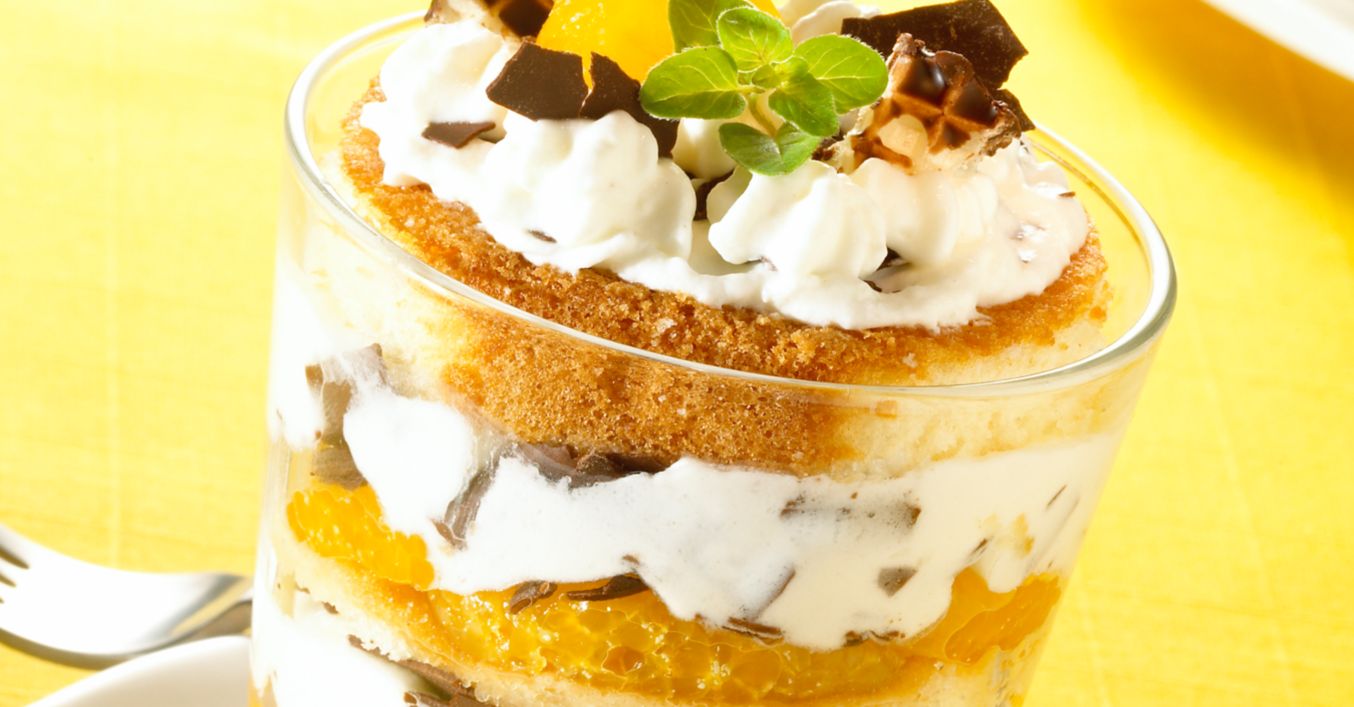 Für die Füllung Mandarinen abtropfen lassen. Von den Schokoküssen die Waffeln abtrennen und beiseite legen. Schokokuss-Schaummasse mit Sahnequark, Zitronensaft, Zucker und saurer Sahne verrühren. Schlagsahne mit Sahnesteif steif schlagen und unter die Quarkmasse heben. Mit einem Dessertglas 12 Kreise aus dem Biskuit ausstechen. Biskuitkreise, Mandarinen und Quarkmasse abwechselnd in die Dessertgläser schichten, dabei mit Biskuit anfangen und enden. Törtchen mit einem restlicher Sahne, Waffeln, Mandarinen und Minze garniert servieren.