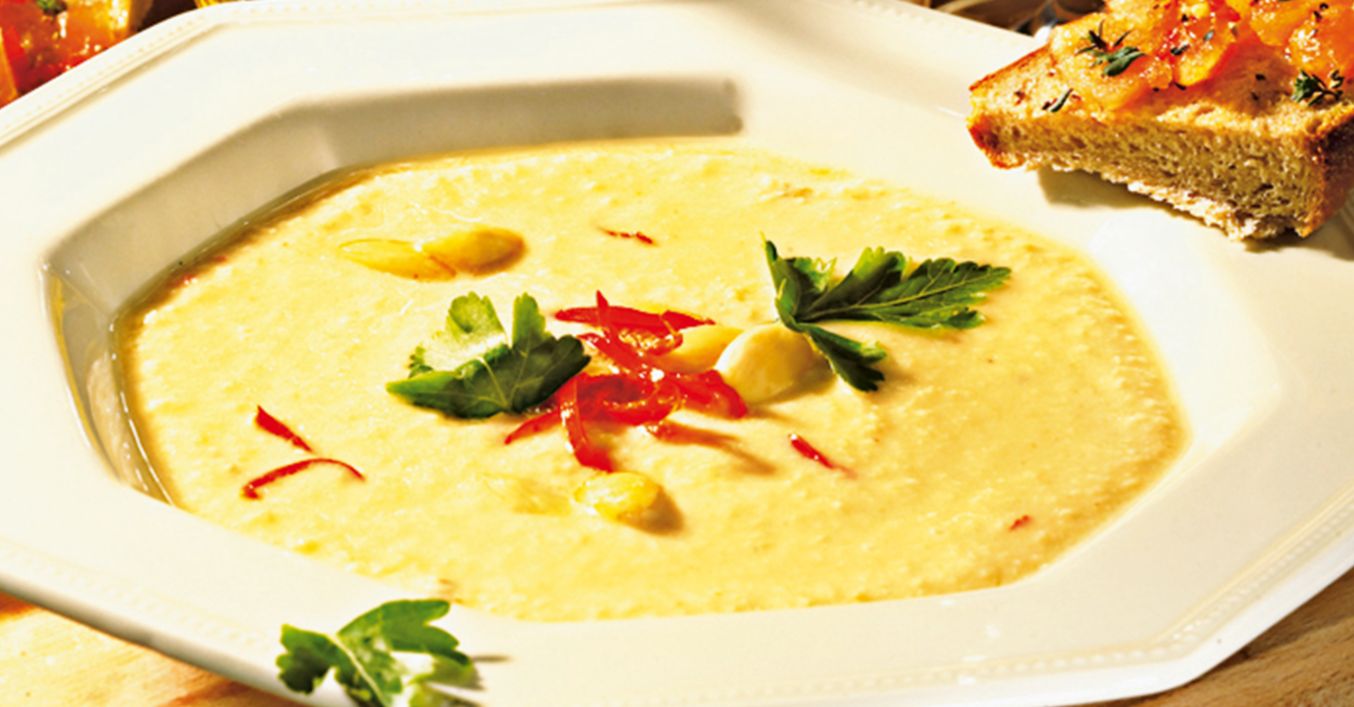 Suppe pürieren und mit Salz, Pfeffer und Muskatnuss abschmecken. Suppe nach Wunsch mit Mandeln, Chilistreifen und Petersilie garniert servieren. Dazu schmeckt Brot mit pikant gewürzten Tomatenwürfeln.
