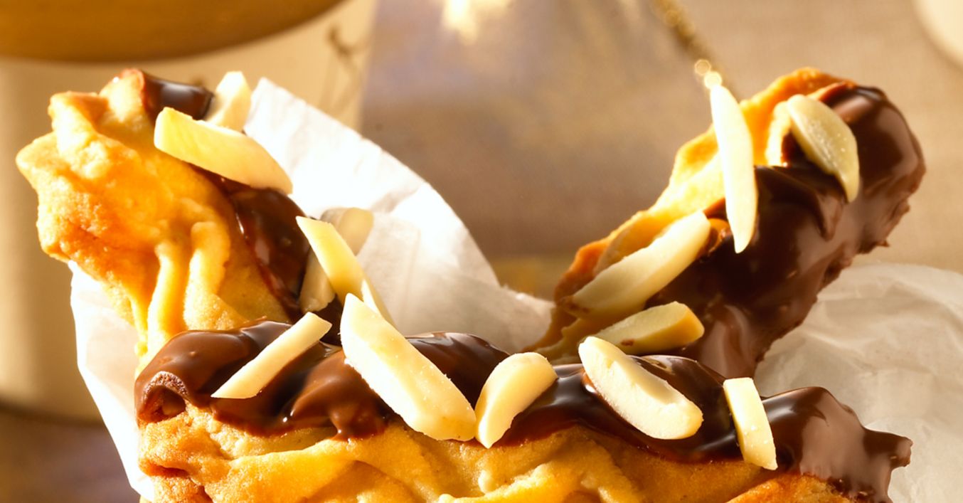 Mandelwellen abkühlen lassen. Kuvertüre nach Packungsanweisung vorbereiten. Mandelwellen mit einer Hälfte hineintauchen, auf Backpapier setzen, sofort mit Mandelsplittern bestreuen und trocknen lassen.
