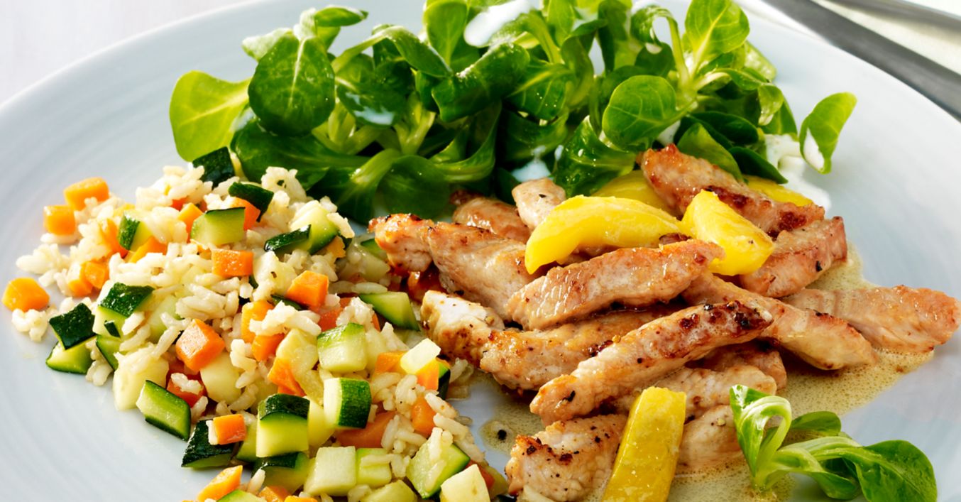 Feldsalat waschen und putzen. Restliche Buttermilch und Essig verrühren, mit Salz und Pfeffer würzen und mit dem Salat vermischen. Putenstreifen mit Gemüsereis und Salat auf Teller anrichten und servieren.