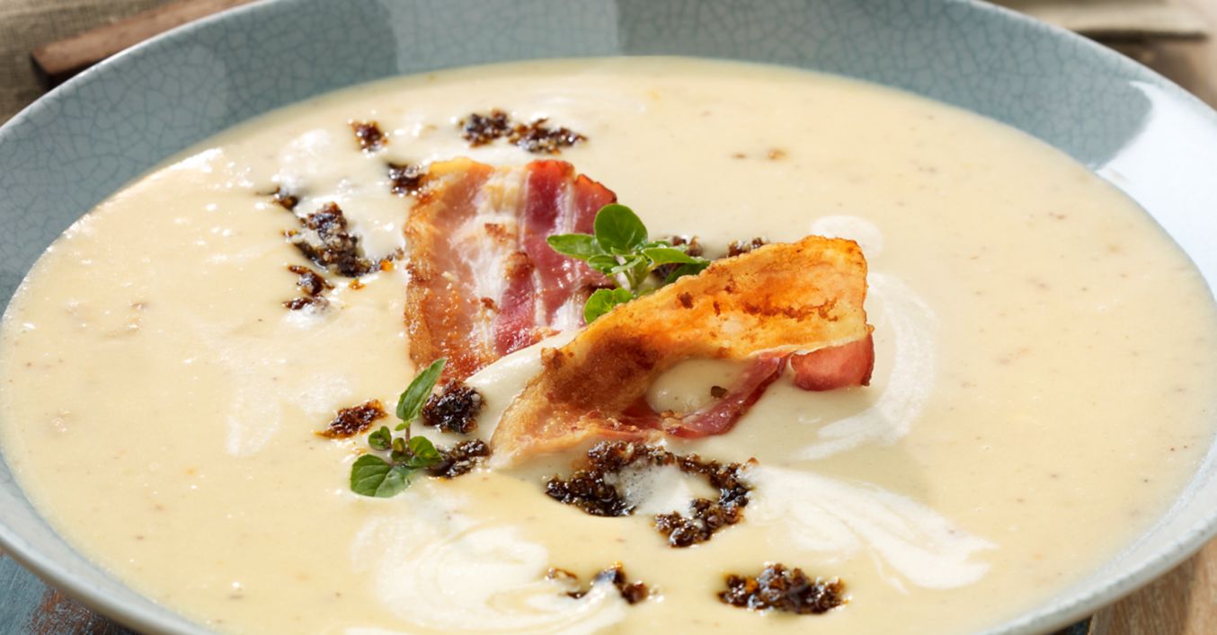 Maronensuppe mit gebratenem Speck und Pflaumentopping
