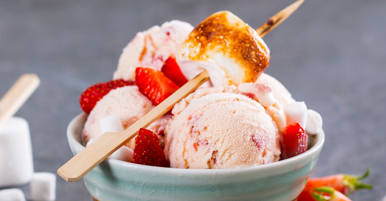 Eis portionieren, mit je einem geflämmten Marshmallow garnieren und sofort servieren.