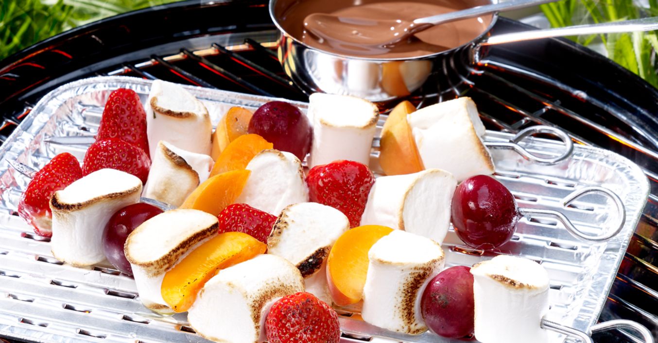 Spieße in einer Grillschale auf dem Grill zubereiten und mit der Schokosoße servieren.