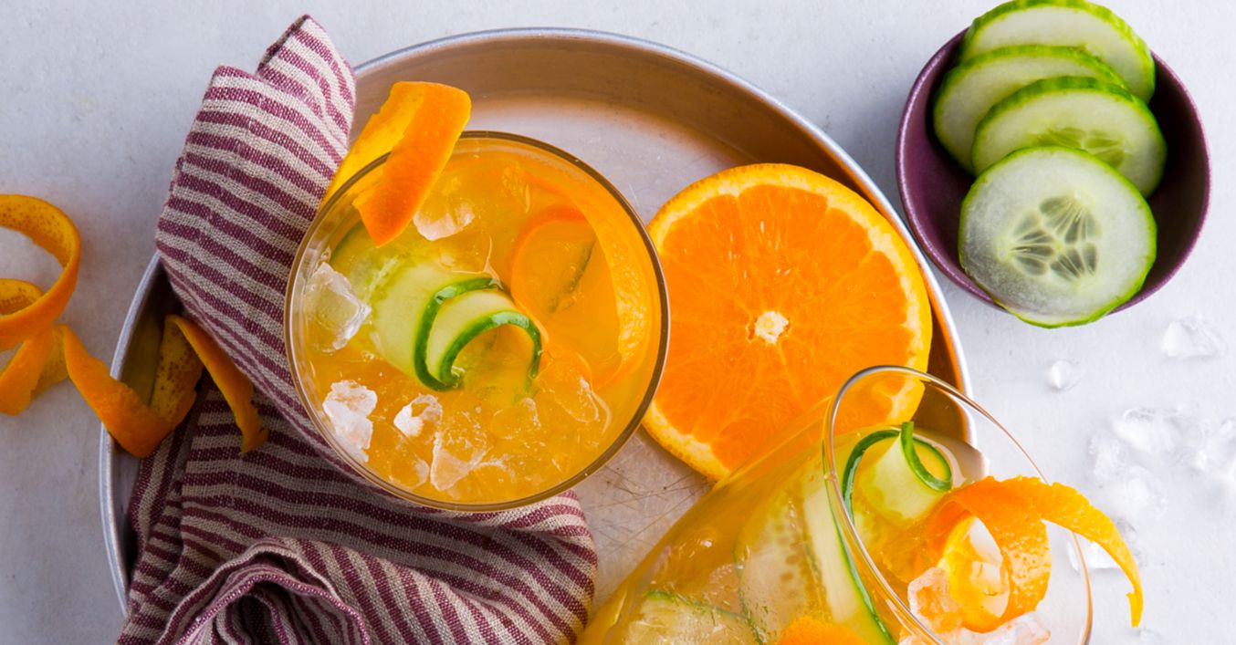 Gurke und Orange waschen. Mit einem Sparschäler von der Gurke einige feine Streifen und von der Orangenschale einige circa 10 Zentimeter lange Streifen abschneiden.