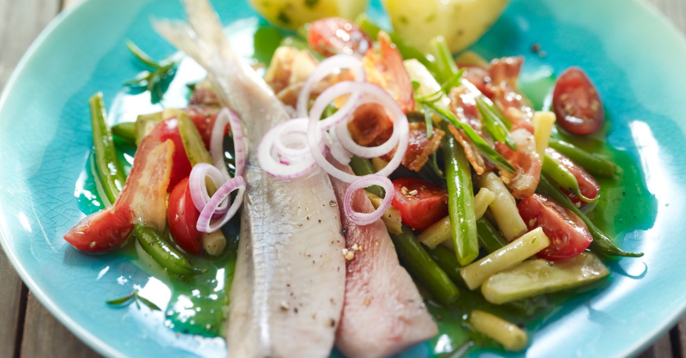Mit den Matjes auf Tellern anrichten und nach Wunsch mit neuen, kleinen Pellkartoffeln servieren.