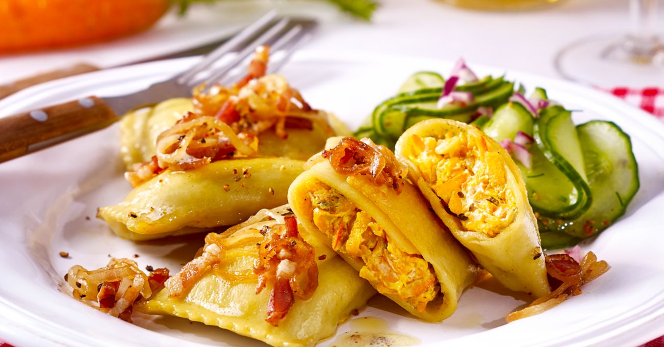 Den Teig halbieren und auf einer bemehlten Arbeitsfläche circa 2 Millimeter dick (36 x 36 Zentimeter) ausrollen. Die Teigplatte in 16 Quadrate teilen und in die Mitte der Quadrate die Füllung geben. Die zweite Teigplatte auflegen, dabei die Ränder gut andrücken und mit einem Messer oder einem Teigrad ausschneiden.