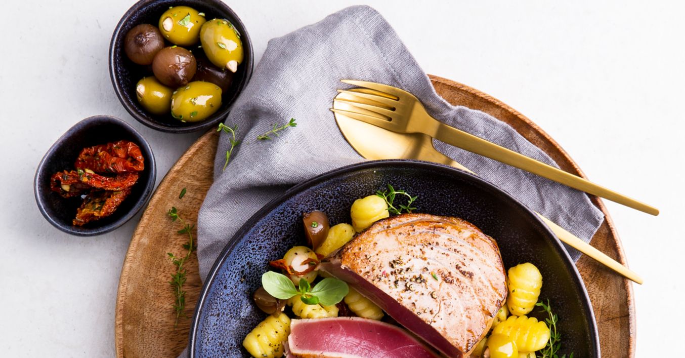 Thunfischsteaks mit Safran-Erbsen-Gnocchi, Antipasti-Oliven und getrockneten Tomaten auf Tellern anrichten und servieren.