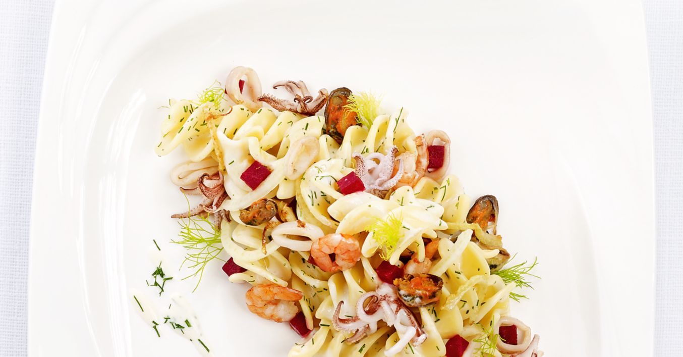 Knoblauch abziehen, zerdrücken und in erhitztem Öl anbraten. Meeresfrüchte zugeben, circa 5 Minuten mitbraten und in die Sauce geben. Meeresfrüchte mit Sauce, Gemüse und Nudeln auf Tellern anrichten, mit gehacktem Fenchelgrün garniert servieren.