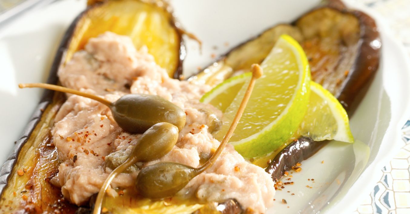 Thunfisch mit Öl und Weißwein im Mixer pürieren. Die Hälfte der Kapernfrüchte in kleine Würfel schneiden und unterheben. Auberginen auf einer großen Platte nebeneinander anrichten und die Thunfischpaste darüber verteilen. Nach Wunsch mit Limettenspalten und restlichen Kapernfrüchten garniert servieren.