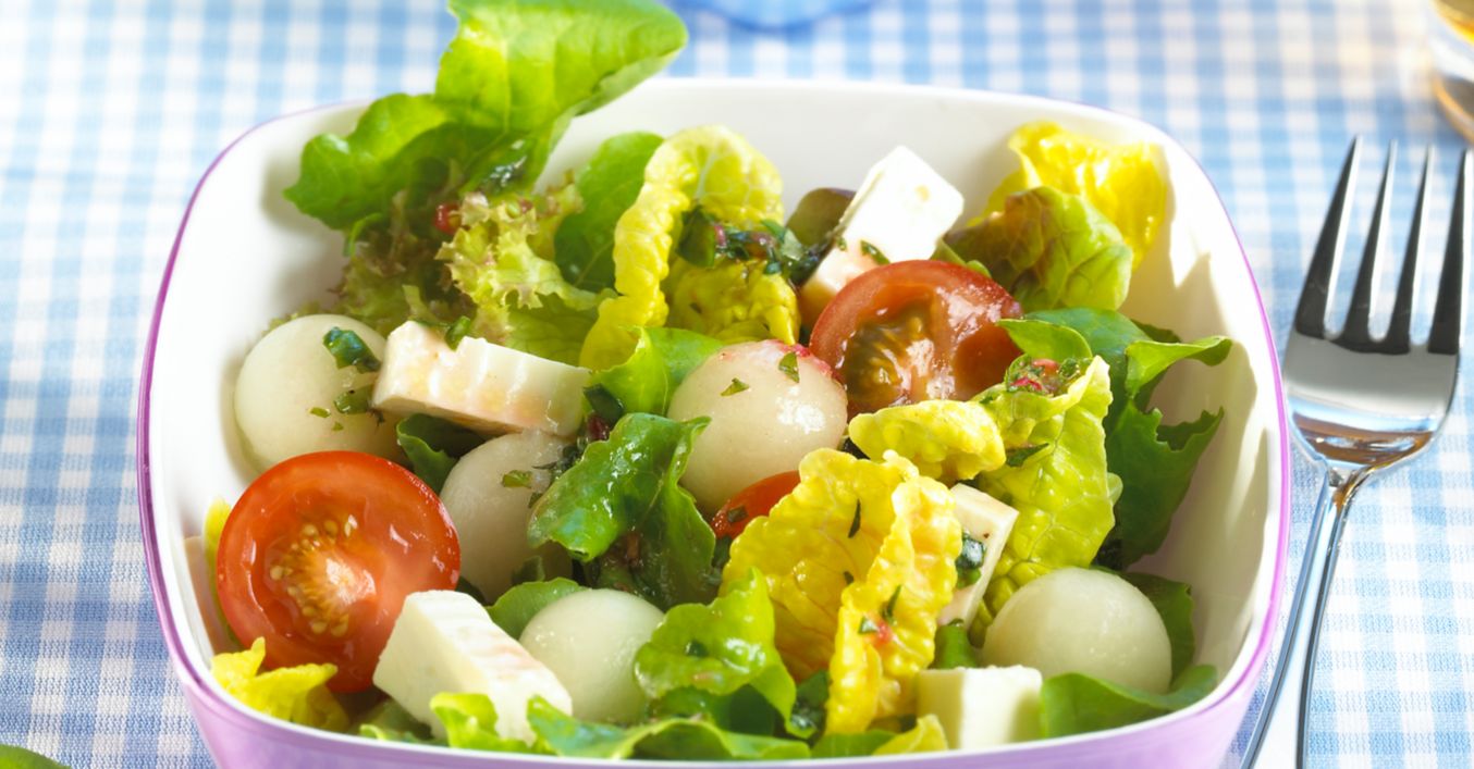 Blattsalat in mundgerechte Stücke zupfen, Petersilie und Basilikum fein hacken, Tomaten halbieren und Fetakäse in Würfel schneiden. Aus der Melone Kugeln ausstechen.
