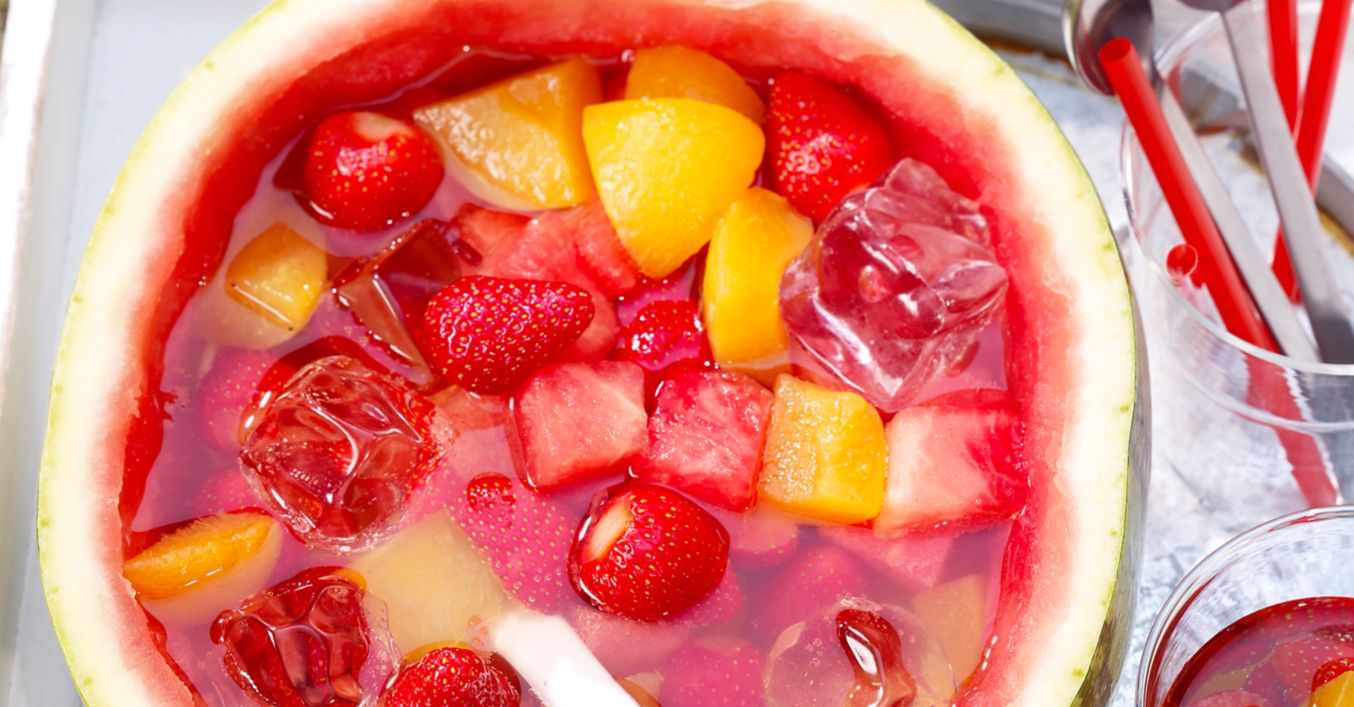 Erdbeeren, Aprikosen und Melone in Stücke schneiden, mit Eiswürfeln in ein Bowlegefäß oder nach Wunsch in eine ausgehöhlte Wassermelonenhälfte geben.